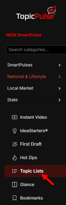 Using Topic Lists, you can create your show prep list right inside of TopicPulse. Simply click Topic Lists in the left-hand menu to get started. | ![]() |
