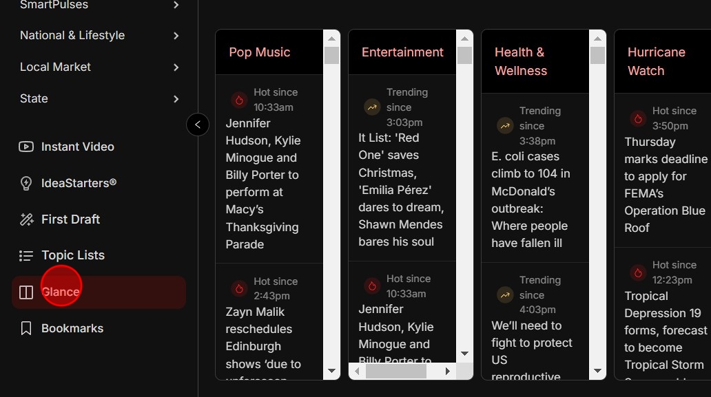 Glance will show you the top 50 stories for each Pulse, what’s gaining speed, and any updates. Current headlines will scroll across the top of the page, highlighting the day's biggest stories.