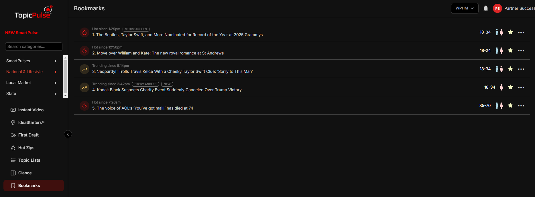 Click on the star icon on any story in TopicPulse to save it to your Bookmarks for later use. Navigate to the Bookmarks section in the left-hand menu to see all your starred stories. Stories will remain in this view until they stop trending and are no longer displayed in TopicPulse. Click on the star again to remove the story from Bookmarks manually.