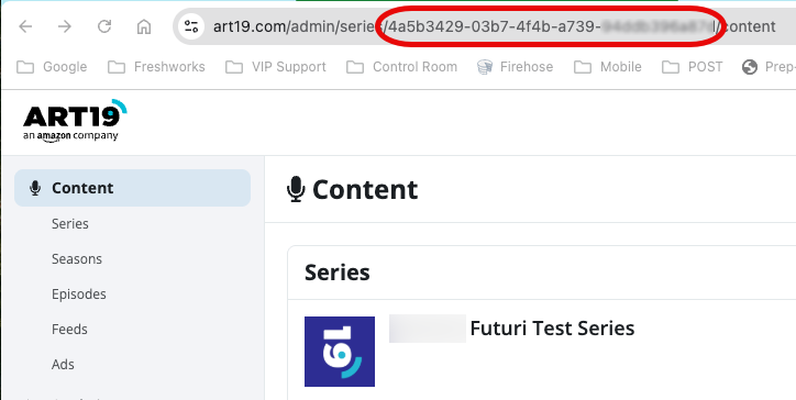 Series ID: Create or identify a series to which POST will publish episodes. Open that series in ART19 and note the string of alphanumeric characters in the URL. This is your ART19 series ID.