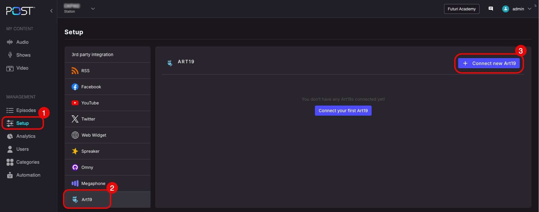 To enable the integration in POST to publish episodes to ART19, follow the steps outlined below.