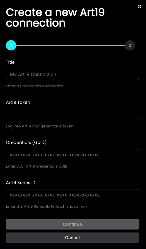 Title your connection and then enter the details you gathered from your ART19 account.